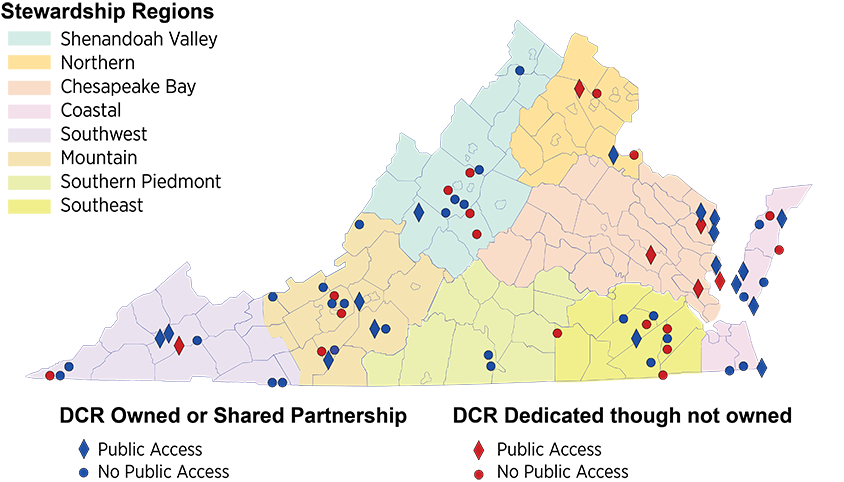 تُدار كل محمية من المحميات الطبيعية في المقام الأول لصالح النباتات والحيوانات والمجتمعات الطبيعية النادرة الموجودة فيها. تتميز اثنتان وعشرون محمية بمرافق وصول عامة منخفضة الكثافة مثل المسارات ومواقف السيارات. وهي مفتوحة على مدار العام خلال ساعات النهار، ولكنها قد تخضع للإغلاق المؤقت لحماية الأنواع الحساسة أو خلال بعض أنشطة الإدارة، مثل الحرق الموصوف. الوصول إلى المحميات الأخرى مقيد ولكن يمكن ترتيب ذلك بشكل عام عن طريق الاتصال بمالك أو مدير الموقع. اقرأ و/أو قم بتنزيل كتيب عن محميات المناطق الطبيعية في فيرجينيا مع إمكانية الوصول العام. تعرف على فرص البحث في محميات المناطق الطبيعية .