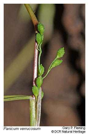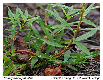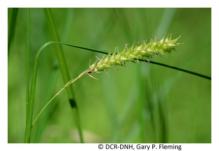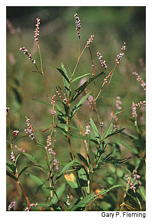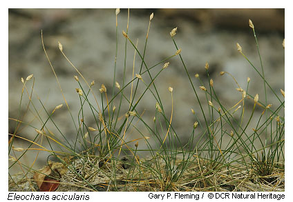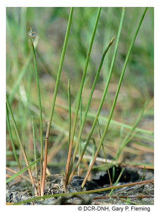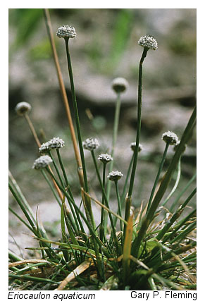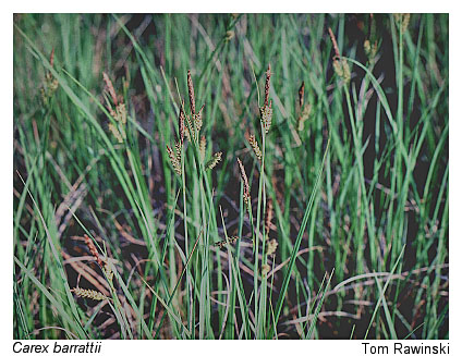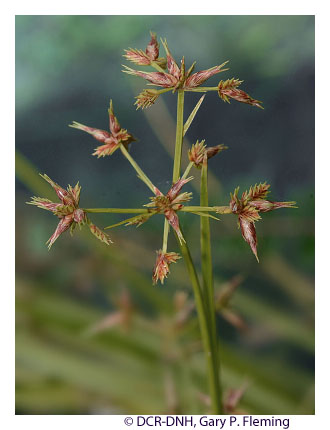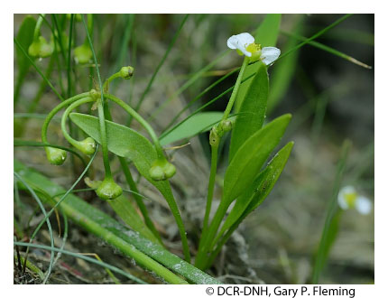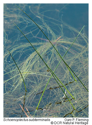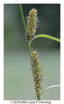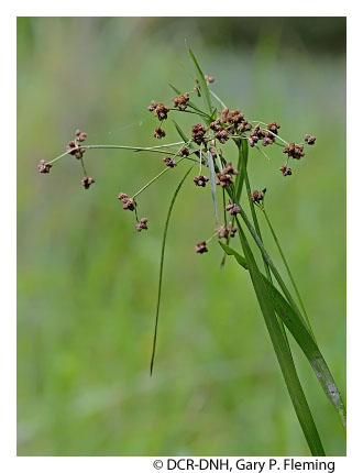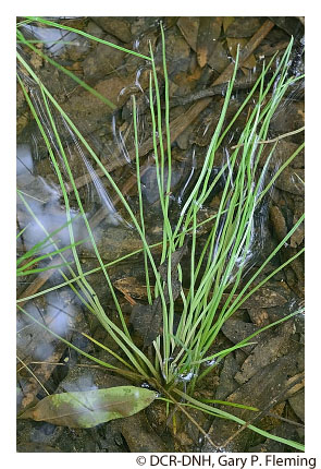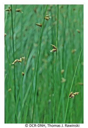 The most widely distributed community type over the Virginia range of these wetlands is a seasonally or semipermanently flooded pond variably dominated by buttonbush (Cephalanthus occidentalis) and three-way sedge (Dulichium arundinaceum var. arundinaceum). Physiognomy varies from a patchwork of buttonbush thickets and herbaceous openings to almost entirely herbaceous. Other characteristic species, varying from site to site, include broad-leaved arrowhead (Sagittaria latifolia), northeastern bulrush (Scirpus ancistrochaetus), inflated sedge (Carex vesicaria), bladderworts (Utricularia spp.), common mermaid-weed (Proserpinaca palustris), mild water pepper (Persicaria hydropiperoides), pale mannagrass(Torreyochloa pallida var. pallida), creeping spikerush (Eleocharis palustris, = Eleocharis smallii), and Canada mannagrass (Glyceria canadensis). Additional species more typical of ponds or zones with shallower flooding and/or shorter hydroperiods include winterberry (Ilex verticillata), highbush blueberry (Vaccinium corymbosum), common greenbrier (Smilax rotundifolia), small beggar-ticks (Bidens discoidea), silvery sedge (Carex canescens var. disjuncta), hop sedge (Carex lupulina), tussock sedge (Carex stricta), sharp-scaled mannagrass (Glyceria acutiflora), eastern mannagrass (Glyceria septentrionalis), dwarf St. John's-wort (Hypericum mutilum), and rushes (Juncus spp.).