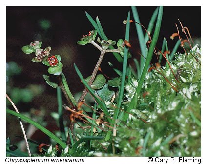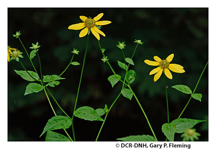 Montane Woodland Seeps are saturated herbaceous wetlands occurring on relatively steep, often gravelly or bouldery slopes at sites of groundwater discharge. These communities are scattered in the western Virginia mountains and Piedmont foothills, but are most abundant above 760 m (2500 ft) elevation. The habitats are typically narrow, rocky, and partially shaded by tree species rooted in adjacent upland forests. A few occurrences encompass large spring seeps on high-elevation cliffs. Vegetation is similar to the herbaceous component of seepage swamps, but is usually more forb-rich. Common species include scarlet beebalm (Monarda didyma), southeastern cutleaf coneflower (Rudbeckia laciniata var. digitata), orange jewelweed (Impatiens capensis), rough-leaved goldenrod (Solidago patula), rough-stemmed goldenrod (Solidago rugosa var. rugosa), white turtlehead (Chelone glabra), golden saxifrage (Chrysosplenium americanum), golden ragwort (Packera aurea), American false-hellebore (Veratrum viride), marsh blue violet (Viola cucullata), marsh marigold (Caltha palustris var. palustris), eastern rough sedge (Carex scabrata), and, in the southern Blue Ridge, umbrella-leaf (Diphylleia cymosa). Graminoids, including bluejoint (Calamagrostis canadensis), shortbeak sedge (Carex baileyi), and nodding sedge (Carex gynandra), may be prominent locally.