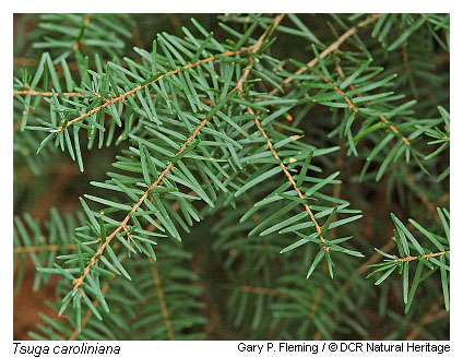 يهيمن الشوكران كارولينا(Tsuga caroliniana)، وهو نبات متوطن في جنوب الأبالاش ذو نطاق محدود للغاية، على غابات هذه المجموعة أو يشارك في السيطرة عليها. وتوجد هذه الغابات فقط في ولايات كارولينا الشمالية وكارولينا الجنوبية وتينيسي وفرجينيا، وهي متناثرة في جنوب بلو ريدج وأحياناً في المقاطعات المجاورة. في ولاية فرجينيا، تحتل هذه النباتات بعض المناطق المحلية على المنحدرات الجبلية الجافة في بلو ريدج وريدج والوادي في الجزء الجنوبي الغربي من الولاية، جنوب نهر جيمس. يُعرف حامل واحد من جرف نهر في جنوب بيدمونت (مقاطعة بيتسلفانيا). وعادةً ما تكون المواقع شديدة الانحدار وصخرية ذات تربة ضحلة فقيرة بالمغذيات. ومن الأنواع الشائعة المرتبطة به البلوط الكستنائي(Quercus montana)، والبلوط الأبيض(Quercus alba)، والبلوط القرمزي(Quercus coccinea)، والصنوبر(Pinus spp.)، والصنوبر الأسود(Nyssa sylvatica)، وشجيرات إيركيسية متنوعة. تتنوع فيزياء الساقية من المظلة المغلقة إلى المفتوحة جداً التي تقترب من بنية الغابات. وغالباً ما تتواجد هذه المجتمعات في فسيفساء رقعة مع نباتات البلوط/الشث المتأثرة بالنار ونباتات الصنوبر-البلوط/الشث. قد تكون الحرائق عاملاً مهماً في حصر شجر الشوكران في كارولينا، وهو نوع من الأنواع التي لا تتحمل الحرائق، في المناطق الصخرية والمنحدرات المحمية إلى حد ما من الاحتراق. في الوقت الراهن، تشكل آفة حشرة الشوكران الصوفي(Adelges tsugae) التي تم إدخالها إلى ولاية فرجينيا تهديدًا كبيرًا لاستمرار شجيرات الشوكران في ولاية فرجينيا. وقد تضررت العديد من الشجيرات بشكل خطير بسبب نفوق الشوكران بشكل كبير. تعتبر أنواع المجتمعات في هذه المجموعة نادرة عالمياً بشكل عام.