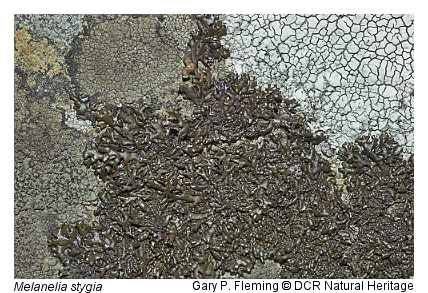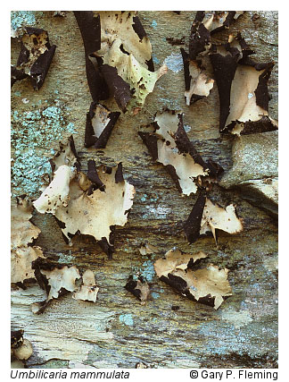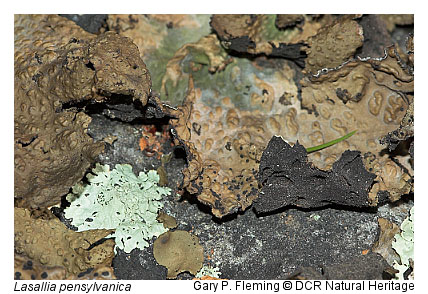 تدعم الأحجار الرملية النادرة وحقول الكوارتزيت الحدودية النادرة فوق 1 ،200 م (4 ،000 قدم) في جبال ريدج آند فالي وجبال أليغيني في فيرجينيا وفيرجينيا الغربية رابطة مختلفة من الأشنات تتميز بهيمنة أومبيليكاريا مويلينبيرجي ووجود أنواع من أشنات جبال الألب الشمالية مثل ميلانيليا ستيجيا وأركتوبارميليا سنتريفوجا. تنحصر حقول الصخور المتحولة القاعدية في المرتفعات العليا من شمال فيرجينيا بلو ريدج، حيث توجد أكثر طبقات الميتابازالت (الحجر الأخضر) مقاومة. تشمل الأنواع المميزة هنا ستيريوكولن جلوسيسينس، ولاساليا بابولوسا، وكريسوثريكس كلورينا، وأوسنيا هالي، وأسبيسيليا سينيريا، وديبوسشيستس سكروبوسوس، وبوربيديا، وريزوبلاكا سوبديسبينس، والعديد من القشور الأخرى. ويوجد في هذا المجتمع العديد من الأنواع الشمالية - الألبية أو المعزولة جغرافياً في هذا المجتمع، بما في ذلك كلادونيا كوكسيفيرا، وميلانليا ستيجيا، وميكروكاليسيوم أريناريوم، وبارميليا أومفالويدس، وبوربيديا، وبوربيديا، وبوربيديا درنك، وريزوكاربون جيوغرافيوم، وأومبيليكاريا كارولينيانا.
