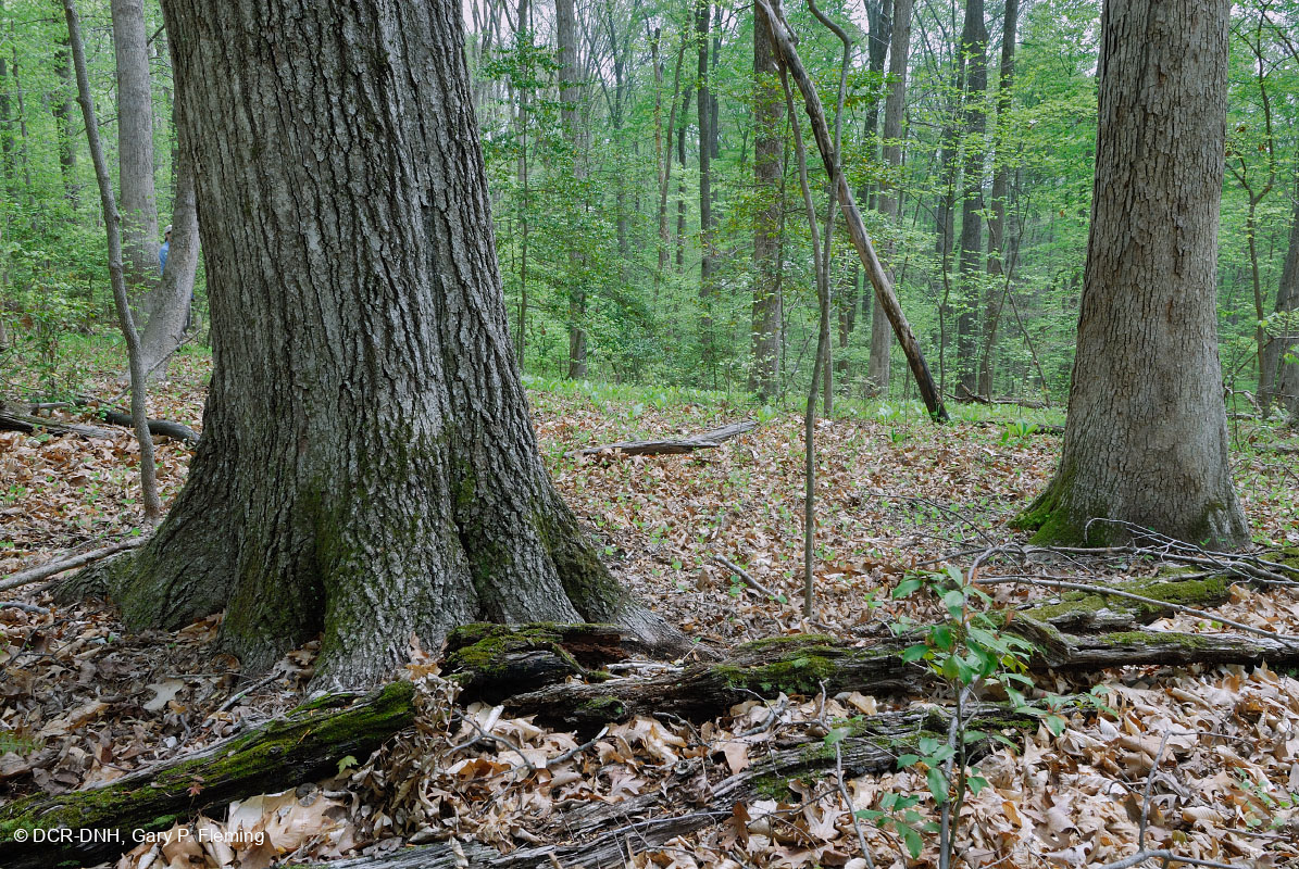يمتد نوع مجتمع بيدمونت الحمضي أوك - هيكوري فورست أحيانًا إلى السهل الساحلي، وربما كان أكثر شيوعًا هناك قبل الاضطرابات الواسعة النطاق بعد الاستيطان. هنا، تهيمن أشجار البلوط الأحمر الشمالي الكبيرة (Quercus rubra) والبلوط الأبيض (Quercus alba) على موقف فوق Goldenvale Creek في محمية Fort AP Hill العسكرية، مقاطعة Caroline. © DCR-DNH، غاري ب. فليمنج