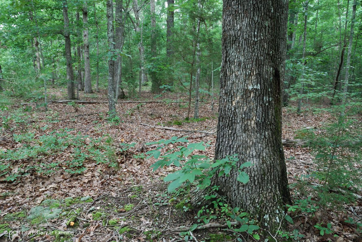 The herb layer of this classic Piedmont acidic oak-hickory forest consists of tree seedlings, patches of early lowbush blueberry (Vaccinium pallidum), and scattered dry-site herbs. Near Reynolds Creek, Cumberland State Forest, Cumberland County. © DCR-DNH, Gary P. Fleming