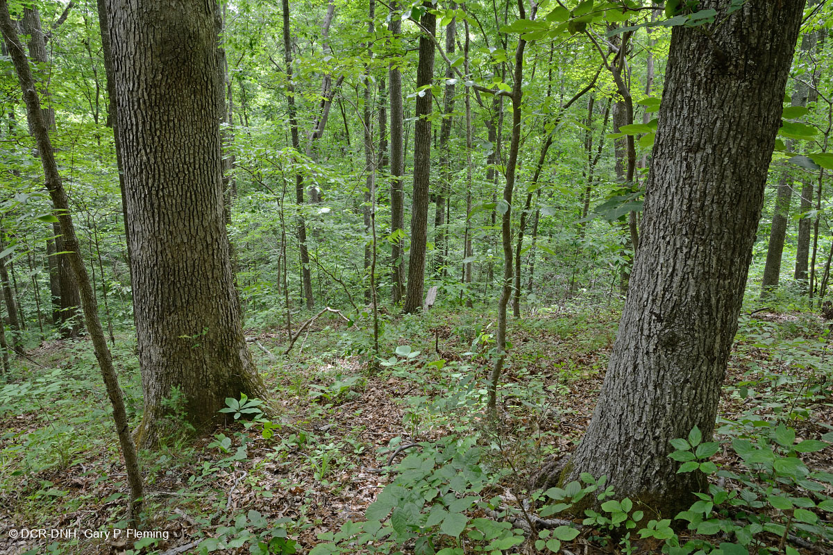 Acidic oak-hickory forest at the "rich" end of the compositional gradient, transitional to basic oak-hickory forest. On slope above the Roanoke (Staunton) River at "The Cove," a 180-degree bend in the river in the northeast corner of Halifax County. © DCR-DNH, Gary P. Fleming