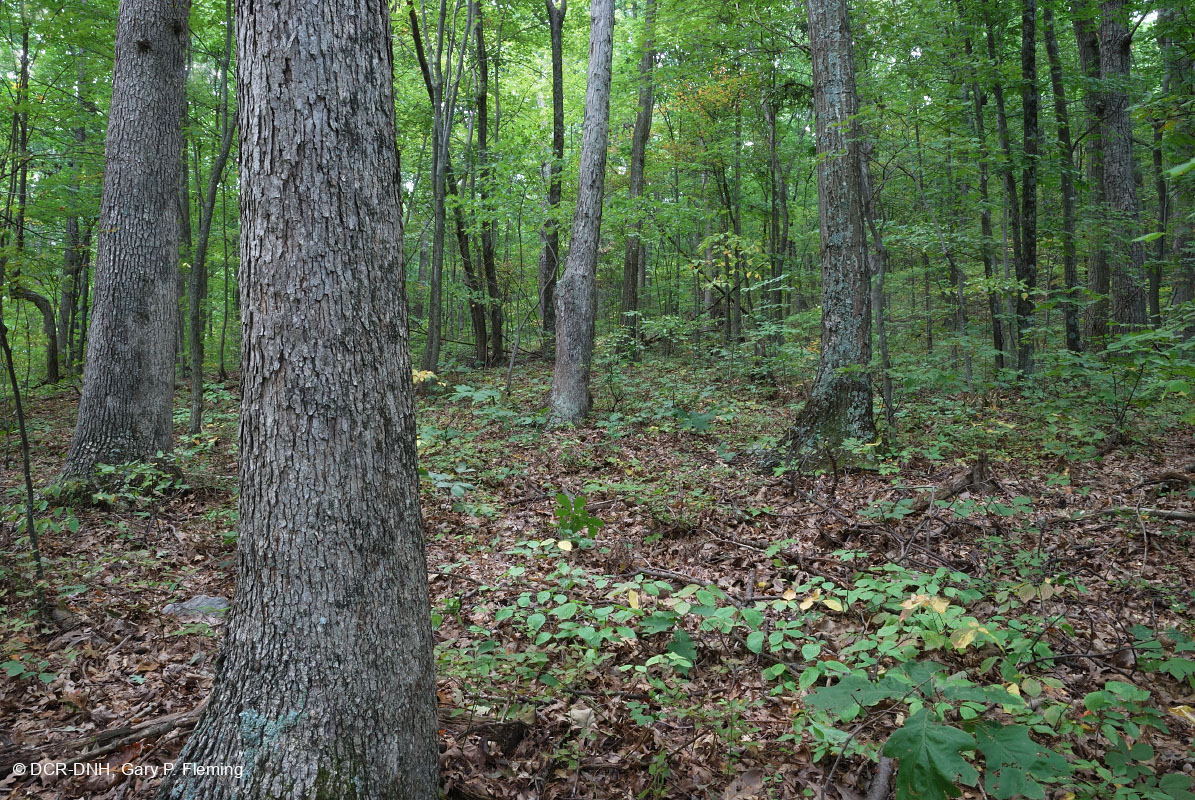 غابة البلوط والجوز الحمضية النموذجية في وسط الأبلاش على الحجر الرملي لجبل ماسانوتن. الجهة الجنوبية الشرقية من جبل فيرست، بين فجوة بيترفيش و غابة رونكلز، مقاطعة Rockingham. منطقة Lee رينجر، غابات جورج Washington وجيفرسون الوطنية. © DCR-DNH، غاري ب. فليمنج
