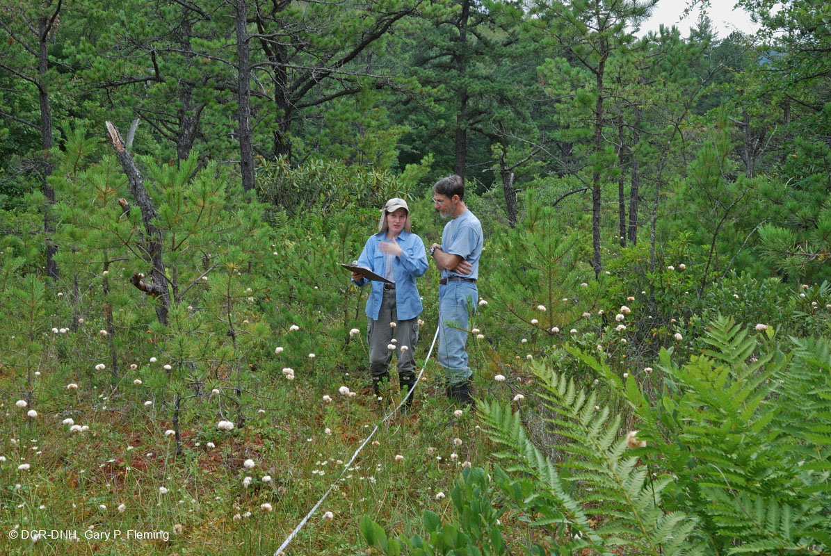 تجمع عالمة البيئة في DCR-DNH كارين باترسون وعالم النباتات في جامعة فرجينيا للتكنولوجيا توم ويبولت بيانات قطعة الأرض من مستنقع الصنوبر على طول نورث فورك ستوني كريك في مقاطعة جايلز. منطقة حراس التقسيم الشرقي، غابات جورج واشنطن & جيفرسون الوطنية. © DCR-DNH، غاري ب. فليمنج