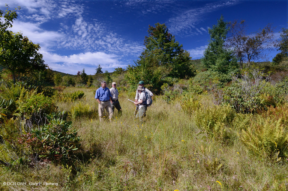 علماء الأحياء في DCR-DNH ومتنزهات الولاية في مستنقع ويلسون كريك السفلى، وهي أرض رطبة تبلغ مساحتها 10فدان على ارتفاع 4400 قدم في متنزه ولاية غرايسون هايلاندز بمقاطعة Grayson. © DCR-DNH، غاري ب. فليمنج