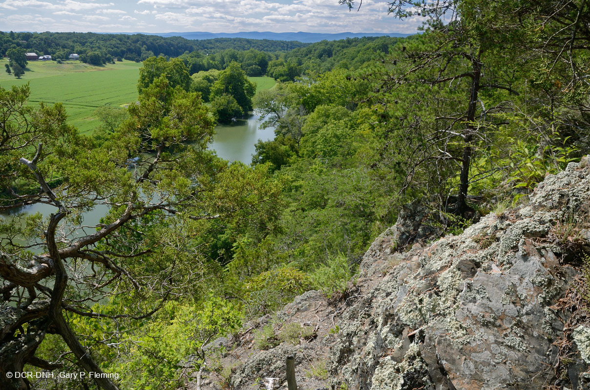 منظر لوادي نهر Shenandoah فورك الشمالي من منطقة قاحلة من الصخر الزيتي عند سفح جبل باول في جبال ماسانوتن، جنوب شرق وودستوك، مقاطعة Shenandoah. حديقة سيفن بيندز الحكومية. © DCR-DNH، غاري ب. فليمنج