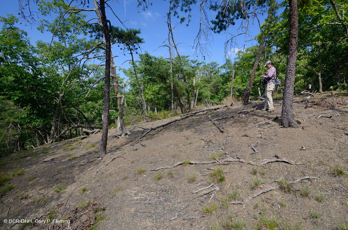 جرداء صخرية جرداء لطيفة إلى حد ما ولكنها جافة وعقيمة للغاية على منحدر جبل باول بالقرب من وودستوك، مقاطعة شيناندواه. لاحظ موت الأشجار على نطاق واسع بسبب الجفاف. متنزه سيفن بيندز ستيت بارك © DCR-DNH، غاري ب. فليمنج