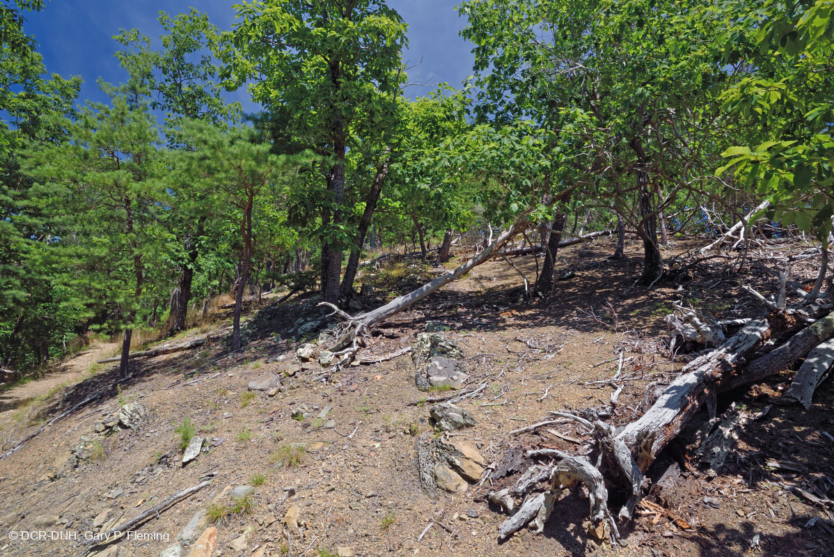 جرداء صخرية جرداء وغير مستقرة إلى حد ما على سلسلة من التلال المتاخمة لنهر ساوث فورك شيناندواه شمال غرب بنتونفيل، مقاطعة وارن. قُتل العديد من أشجار الصنوبر الكبيرة في فرجينيا(Pinus virginiana) بسبب الجفاف. منتزه ولاية شيناندواه ريفر ريفر © DCR-DNH، غاري ب. فليمنج