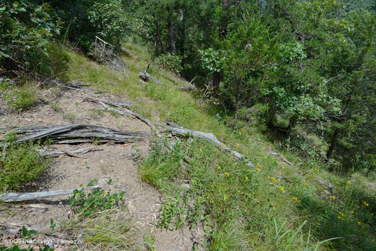 غطاء عشبي كثيف ومتنوع نسبياً في قاحل صخري كلسي صخري قاحل يقابل سورس رن، في الوادي بين جبل سوبين ليك وجبل ليتل نورث ماونتن، مقاطعة Rockingham. منطقة حارس Lee، غابات جورج Washington & جيفرسون الوطنية. © DCR-DNH، غاري ب. فليمنج