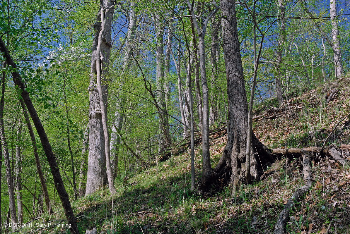 جانب ربيعي من غابة كلسية جافة في السهل الساحلي على منحدر وادٍ على ضفاف نهر جيمس، بالقرب من إيستوفر، مقاطعة سوري. يشارك بلوط تشينكوابين(Quercus muehlenbergii) والجوز القار(Carya cordiformis) في السيطرة على الحامل. © DCR-DNH، غاري ب. فليمنج