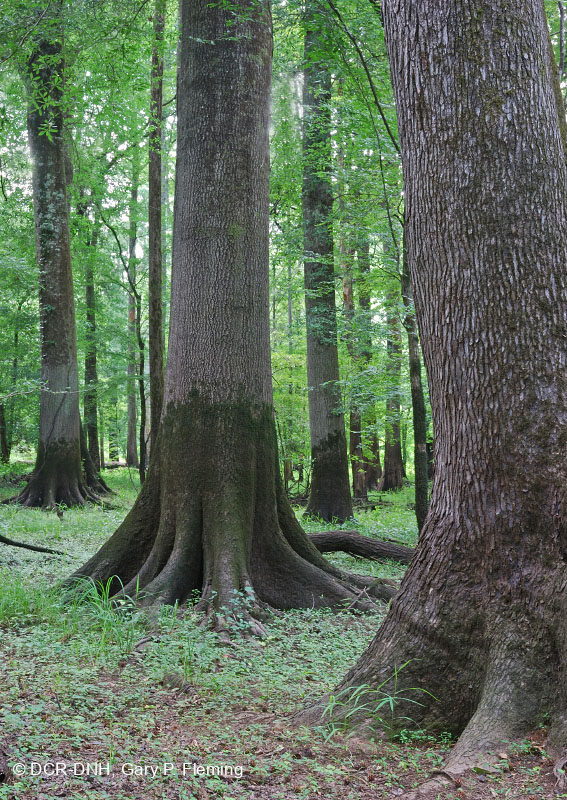 بلوط أوفركوب الناضج(Quercus lyrata) وبلوط الغار(Quercus laurifolia) في مستنقع من الخشب الصلب في قاع الأرض على طول نهر بلاكووتر في مقاطعة جزيرة وايت. محمية منطقة الصنوبر الطبيعية بولاية أنتيوش باينز. © DCR-DNH، غاري ب. فليمنج