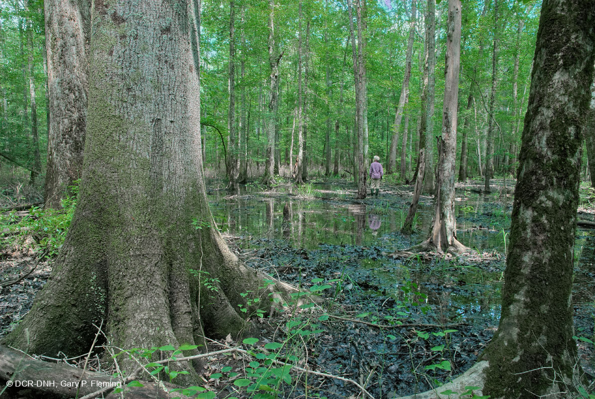 مستنقع من الأخشاب الصلبة منخفض المستوى، ناضج إلى حد ما، يقع على طول نهر Nottoway في مقاطعة Sussex. تشترك أشجار البلوط الكبيرة (Quercus laurifolia) والبلوط المتضخم(Q. lyrata) في الهيمنة. محمية تشوب ساندهيل ستيت الطبيعية. © DCR-DNH، غاري ب. فليمنج