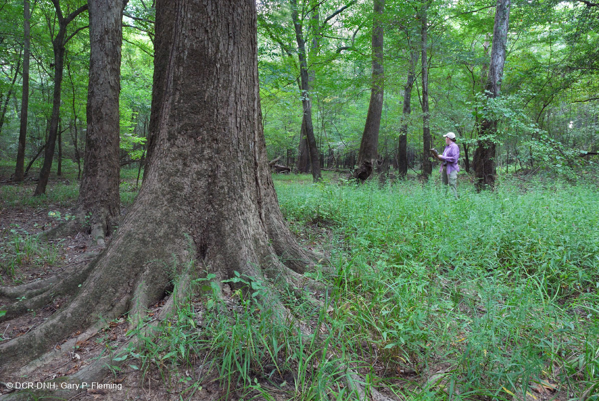 شجرة البلوط (Quercus lyrata)، وشجرة جوز الماء (Carya aquatica)، وأعشاب متنوعة في غابة منخفضة على طول نهر Nottoway جنوب هومفيل في مقاطعة Sussex. © DCR-DNH، غاري ب. فليمنج
