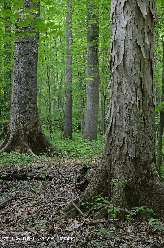 شجرة جوز الماء الناضجة (Carya aquatica)، وشجرة البلوط الدبوسية (Quercus palustris)، وشجرة الصمغ الحلو (Liquidambar styraciflua) في غابة واسعة من الأراضي المنخفضة على طول نهر Meherrin، جنوب Adams Grove في مقاطعة Southampton. © DCR-DNH، غاري ب. فليمنج