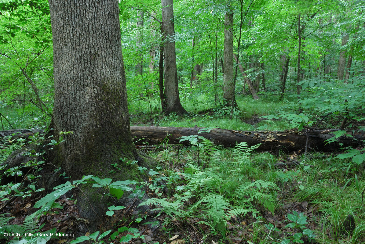 بلوط أوفركوب(Quercus lyrata)، وبلوط الكستناء المستنقعي(Quercus michauxii)، وبردي البروم الشائع(Carex bromoides ssp. bromoides) في غابة مختلطة من سهول البلوط الفيضية على طول مستنقع التنين بالقرب من جسر التنين الجديد في مقاطعة Middlesex. محمية "دراغون ران" التابعة لمنظمة حفظ الطبيعة. © DCR-DNH، غاري ب. فليمنج