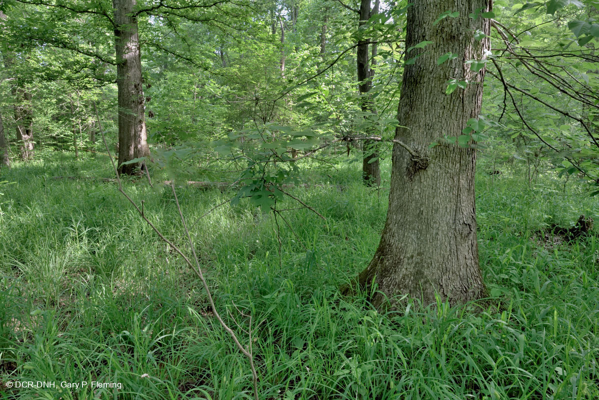 مستنقع مستنقع سهول فيضانية مختلطة من خشب البلوط الناضج مع بلوط الكستناء المستنقعي الكبير(Quercus michauxii) وبلوط الأوفر كوب(Quercus lyrata). يهيمن على طبقة الأعشاب الكثيفة نبات البردي القطيلي(Carex typhina) وعشب القصب الخشبي الشائع(Cinna arundinacea). في المستنقع الخلفي لنهر Appomattox، جنوب شرق بالسفيل، مقاطعة Powhatan. © DCR-DNH، غاري ب. فليمنج