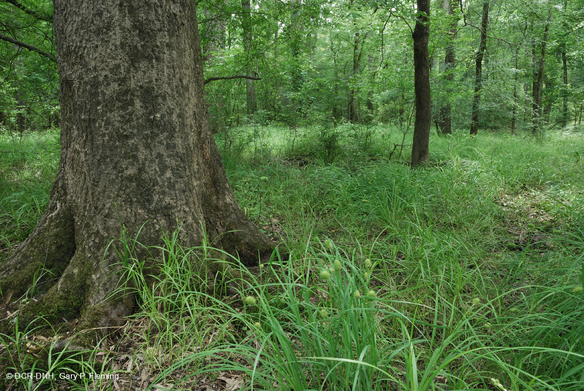 بردي السكواروز البردي(Carex squarrose sedge(Carex squarrosa، المقدمة)، وبردي الكاتيل(Carex typhina)، وبردي آخر تحت بلوط الدبوس الكبير في مستنقع السهول الفيضية لنهر بانيستر شرق وولف تراب في مقاطعة هاليفاكس. خزان جون هـ. كير، منطقة إدارة الحياة البرية جنوب نهر بانيستر © DCR-DNH، غاري ب. فليمنج