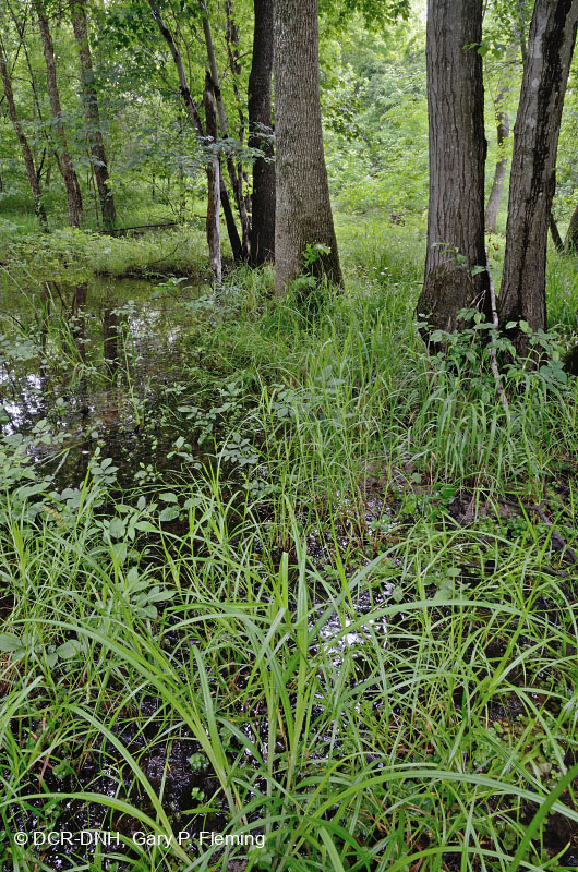 مستنقع خلفي مغمور بالمياه على طول نهر بانيستر، مع بلوط المستنقعات الأبيض(Quercus bicolor)، والقيقب الأحمر(Acer rubrum)، والبردي المتنوع. جنوب شرق سيدار هيل، مقاطعة بيتسلفانيا. © DCR-DNH، غاري ب. فليمنج