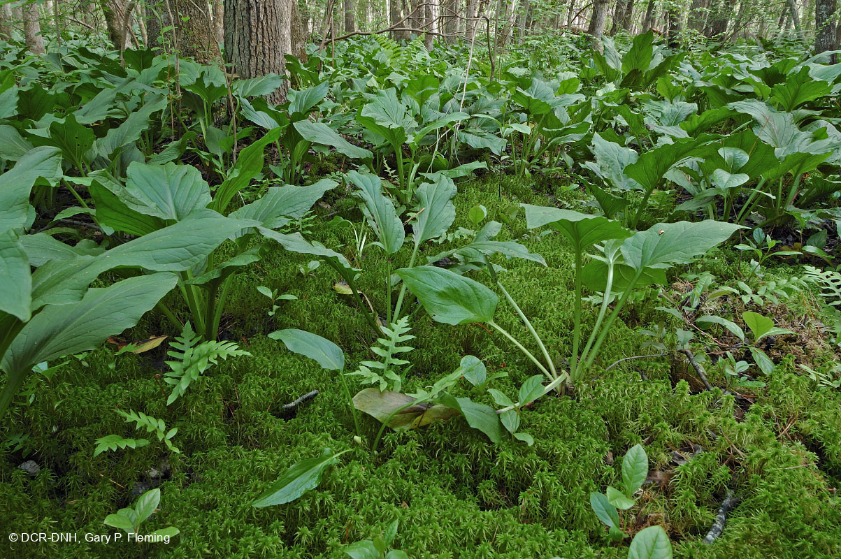ملفوف الظربان(Symplocarpus foetidus) وسرخس السلسلة الصافي(Lorinseria areolata) الذي ينمو في أحواض سميكة من الطحالب في مستنقع تسرب على طول خور تراك تركيا، محمية فورت إيه بي هيل العسكرية في مقاطعة كارولاين. © DCR-DNH، غاري ب. فليمنج