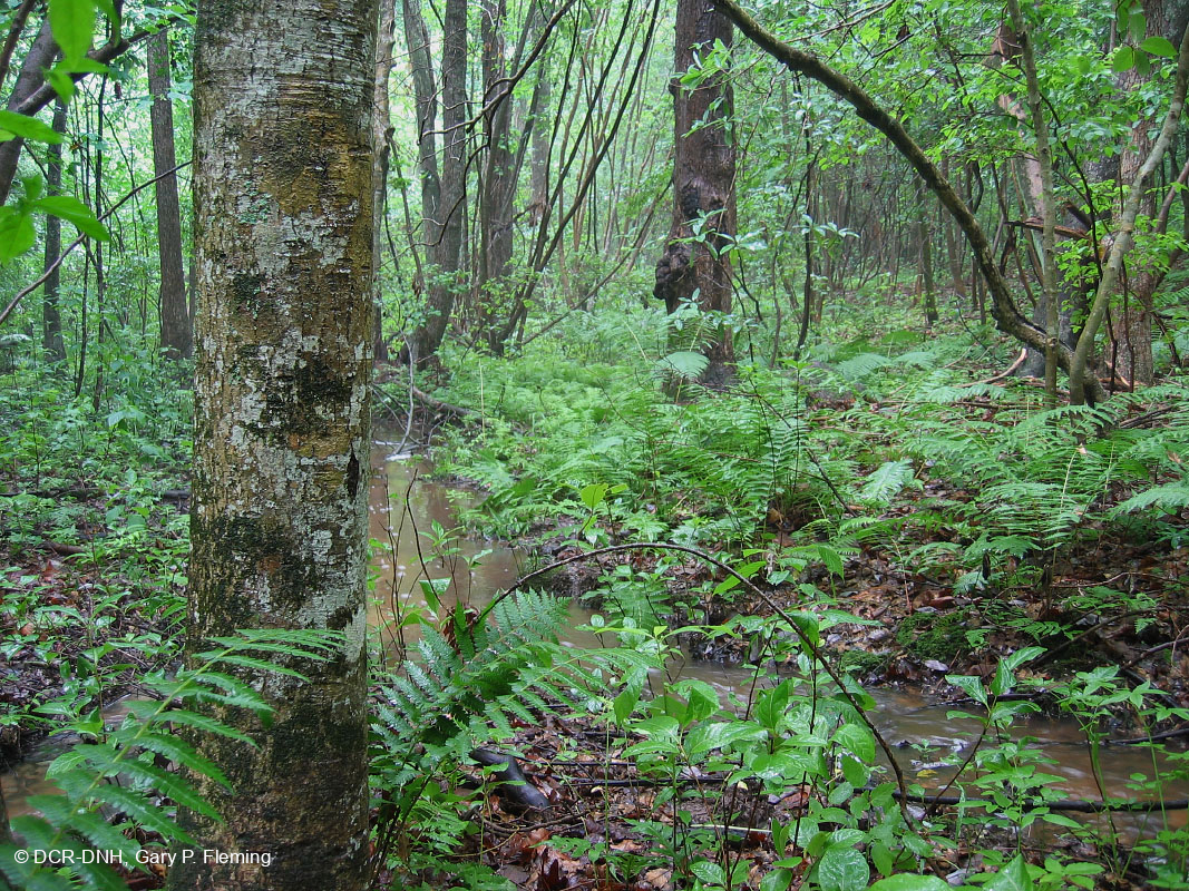 ماغنوليا ماغنوليا الحلوة الكبيرة(ماغنوليا فيرجينيانا، المقدمة اليسرى) في مستنقع تسرب مياه الأمطار على طول رافد يشبه المستنقع في ويسترن رن، عند السفح الجنوبي الشرقي لمالفيرن هيل في مقاطعة هنريكو. حديقة ساحة معركة ريتشموند الوطنية، وحدة مالفيرن هيل. © DCR-DNH، غاري ب. فليمنج