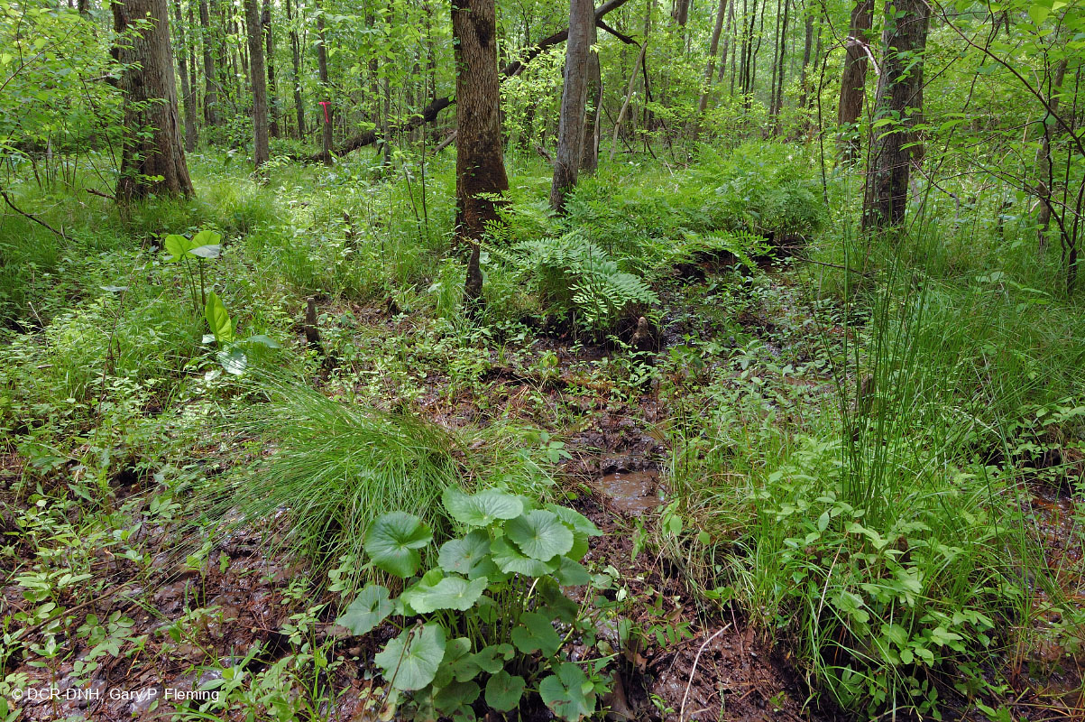 القطيفة المستنقعية(Caltha palustris var. palustris)، البردي الشائع(Carex bromoides ssp. برومويدس)، والسرخس الملكي(Osmunda spectabilis) في مستنقع مستنقع في قاع مستنقع تصب مياهه في كوليدج ران في حديقة ولاية تشيبوكس بمقاطعة سوري. © DCR-DNH، غاري ب. فليمنج
