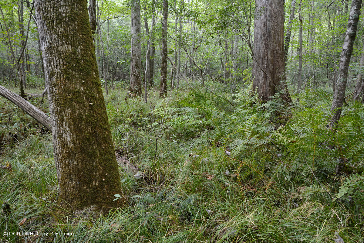 منظر متأخر من الموسم لمستنقع رشح كلسي مع رماد أخضر(Fraxinus pennsylvanica)، وسرو أصلع(Taxodium distichum)، وأعشاب متنوعة؛ في وادٍ رافد لـ College Run في متنزه تشيبوكس ستيت بارك، مقاطعة سوري. © DCR-DNH، غاري ب. فليمنج