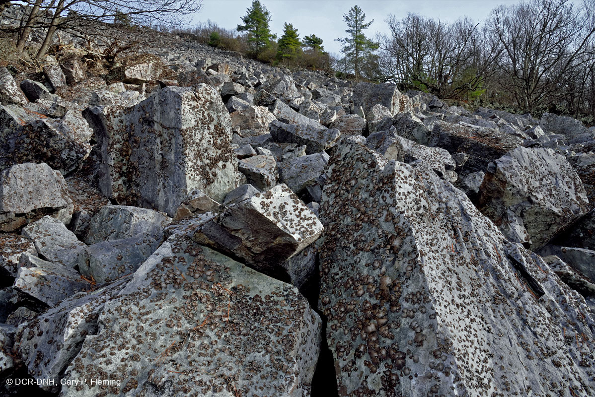 تعتبر الأشنات مثل خطوط الصخور " ذات اللون البني الداكن " Lasallia papulosa و Lasallia pensylanica أقدم أشكال الحياة التي غزت حقول الصخور وبدأت عملية التجوية. بلاك روك، مقاطعة Rockingham، منتزه Shenandoah الوطني. © DCR-DNH، غاري ب. فليمنج