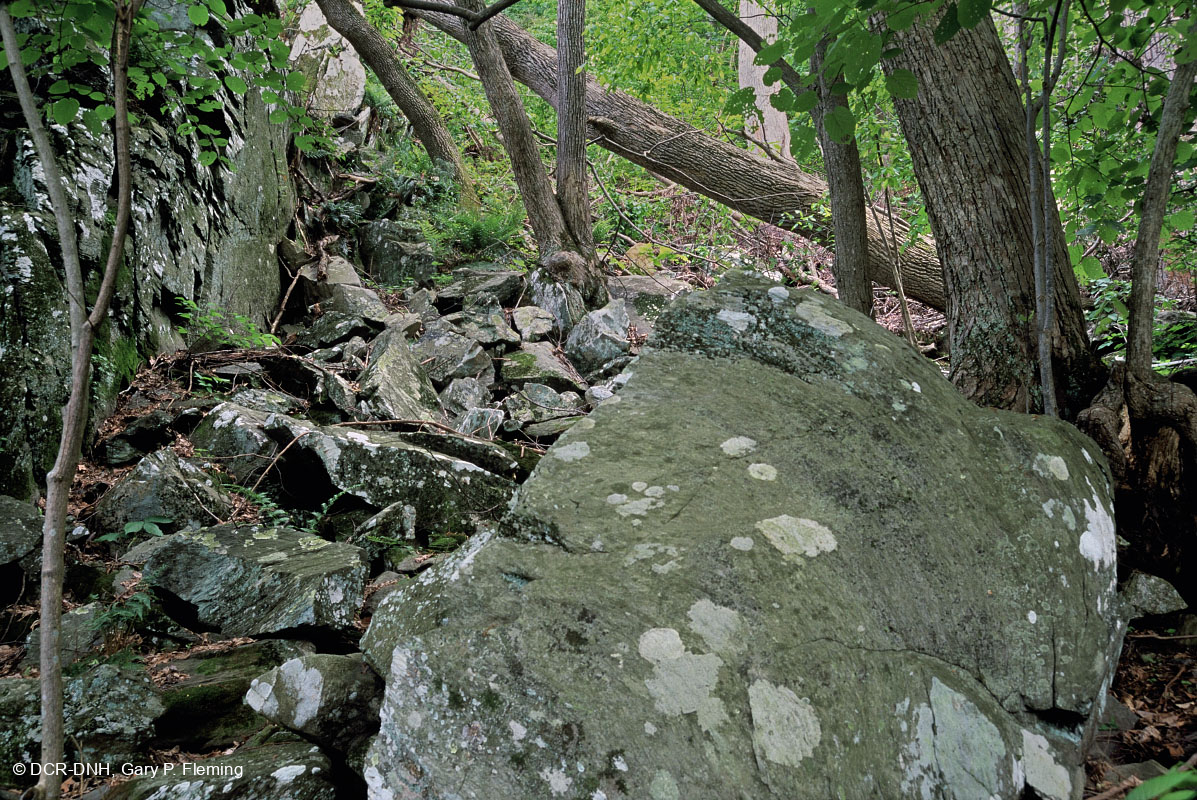 خشب الباسوود الأمريكي(Tilia americana var. americana) تهيمن تماماً على هذه الغابة الصخرية الغنية في وادي بوتوماك. النباتات العشبية محدودة للغاية بسبب قلة التربة. مدرسة ماديرا، مقاطعة فيرفاكس © DCR-DNH، غاري ب. فليمنج