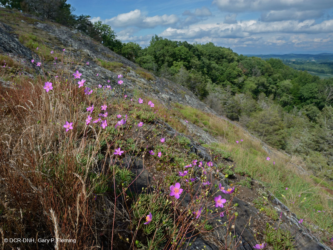 زهرة شهرة بيدمونت(Phemeranthus piedmontanus) وزهرة الشهرة في بيدمونت(Phemeranthus piedmontanus) والقحمة المافوية شديدة الانحدار في بالد نوب، مقاطعة فرانكلين. محمية منطقة بولد نوب الطبيعية بالولاية. © DCR-DNH، غاري ب. فليمنج