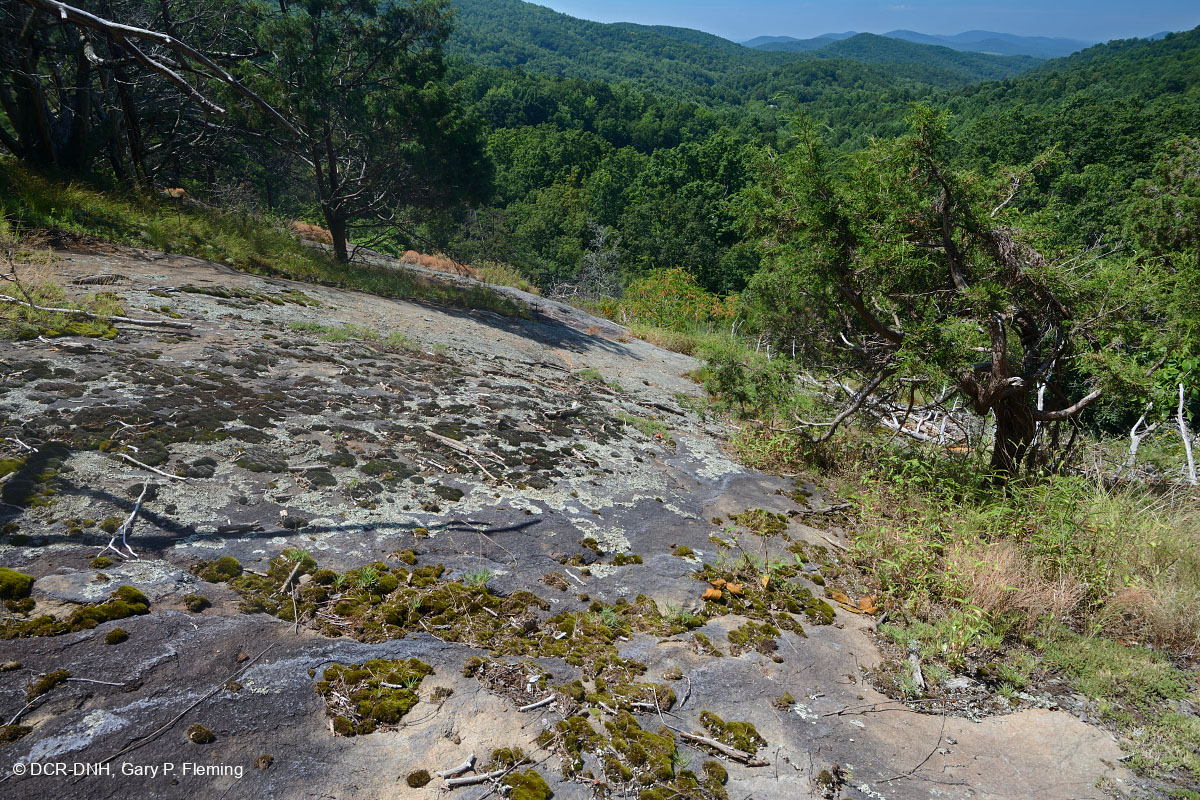 مجتمع قاحل من الصخور المافية على نتوءات ضخمة من الجرانيت الديوريتي شديدة الانحدار في سفوح بلو ريدج في مقاطعة Albemarle. © DCR-DNH، غاري ب. فليمنج
