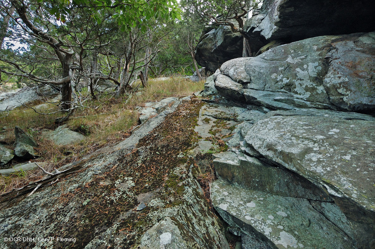 نتوءات ميتابازلتية، وشجرة الأرز الأحمر الشرقية الملتوية (Juniperus virginiana)، والأعشاب في نتوء قاحل على منحدر يواجه الجنوب الغربي على طول نهر روز، مقاطعة Madison، متنزه Shenandoah الوطني. © DCR-DNH، غاري ب. فليمنج