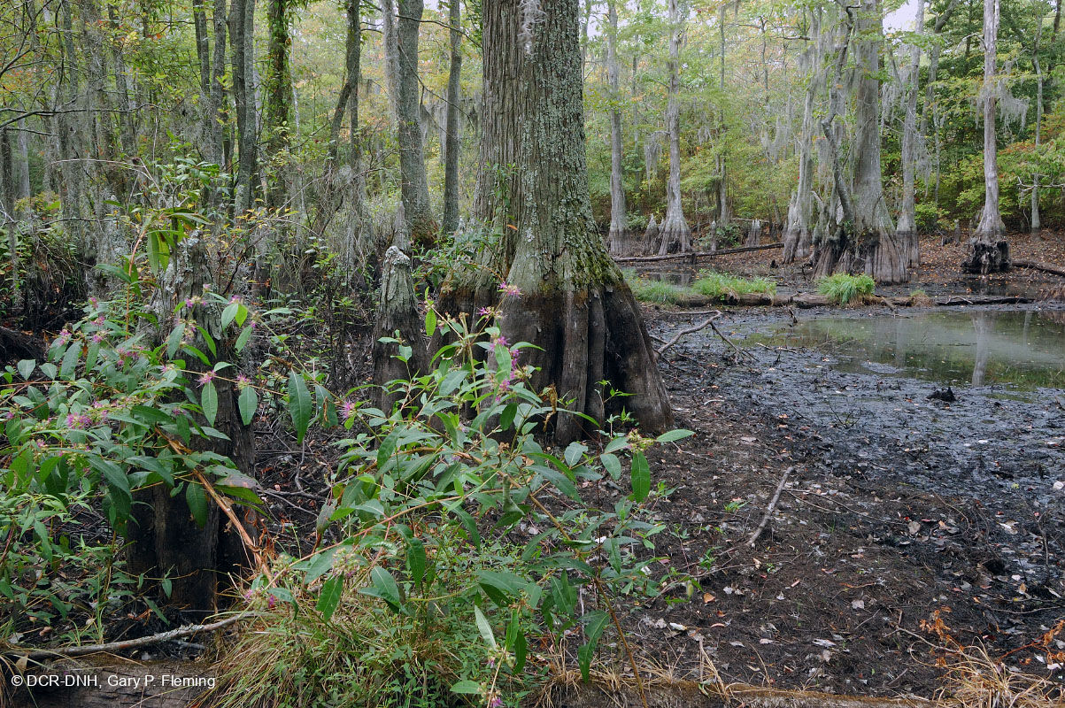 غابة المستنقعات البحرية من خشب السرو الأصلع (Taxodium distichum) مع المستنقعات السائبة (Decodon verticillatus) المزهرة في المقدمة. منتزه فيرست لاندينج الحكومي، مدينة Virginia Beach. © DCR-DNH، غاري ب. فليمنج