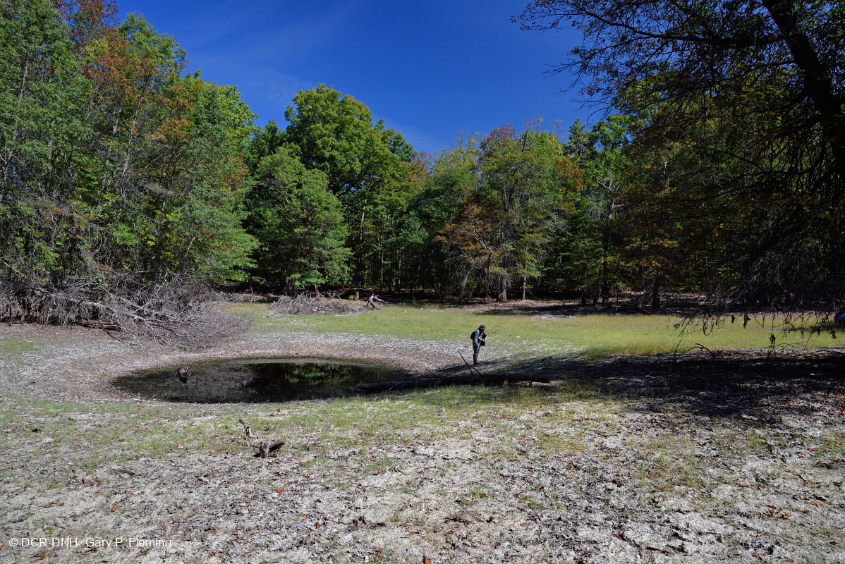 بركة البلوط، في مجمع بركة مابل فلاتس بالقرب من شيراندو، مقاطعة أوغوستا. وهي عبارة عن بركة مجرى وادي شيناندواه النموذجية التي تغمرها المياه موسمياً إلى حد ما، مع حوض طيني تحده بساتين من بلوط الصنوبر(Quercus palustris). تحتفظ الحفرة المركزية العميقة ببعض الماء طوال العام. منطقة حارس غلينوود-بيدلار، غابات جورج واشنطن & جيفرسون الوطنية. © DCR-DNH، غاري ب. فليمنج