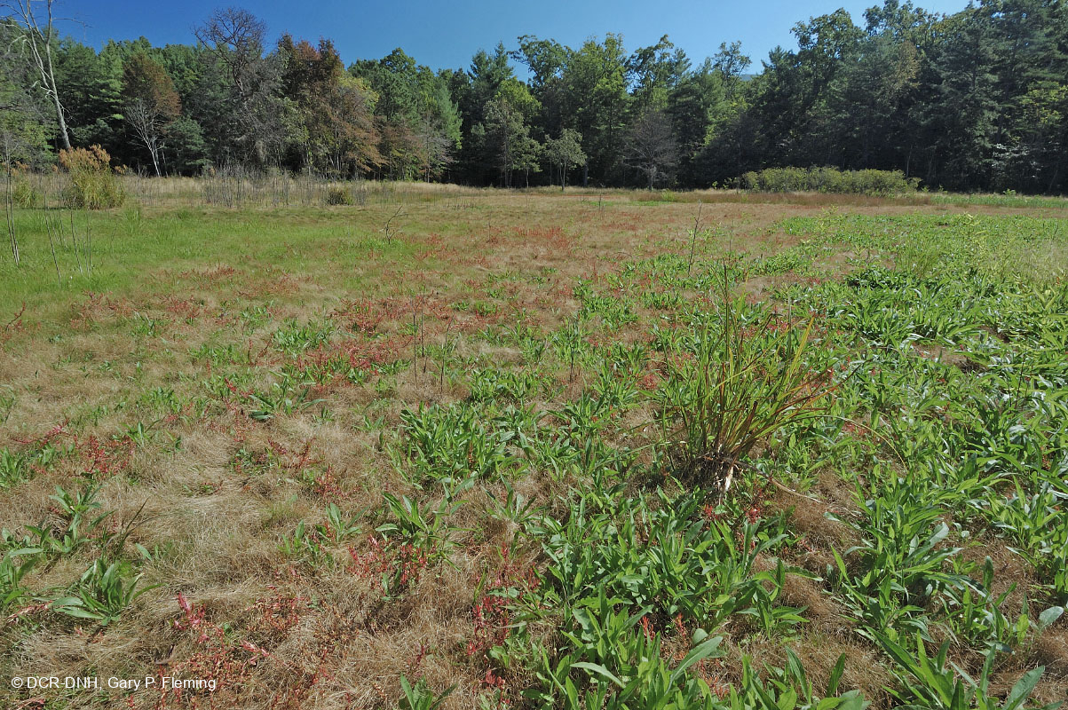 وريدات نبات العطاس Virginia (Helenium virginicum) في حوض بركة Mount Joy Pond الذي تم تجفيفه مؤخرًا بالقرب من Steeles Tavern، مقاطعة Augusta. محمية ماونت جوي بوند الحكومية الطبيعية. © DCR-DNH، غاري ب. فليمنج