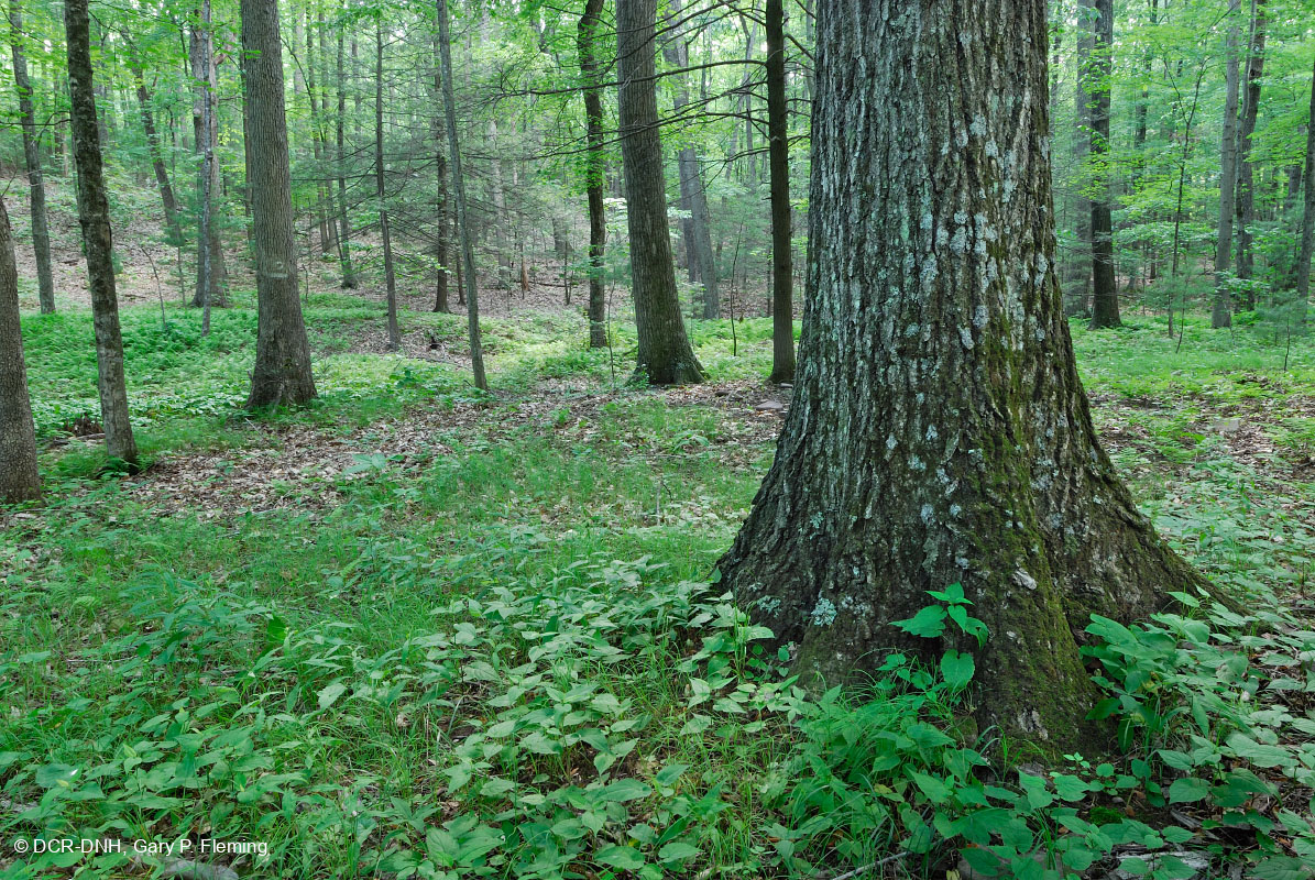غابة جيرية جافة-متوسطة الرطوبة على تراس سهل فيضان جيد التصريف على طول نهر نورث في سفح جبل شيناندواه الشرقي في مقاطعة أوغستا. كان البلوط الأحمر الشمالي (Quercus rubra) والقيقب السكري (Acer saccharum) من الأشجار السائدة في الطبقة العليا من الغابة، مع وجود بعض أشجار الهيملوك (Tsuga canadensis) في الطبقة السفلية. منطقة نورث ريفر، جورج واشنطن & غابات جيفرسون الوطنية. © DCR-DNH، غاري ب. فليمينغ