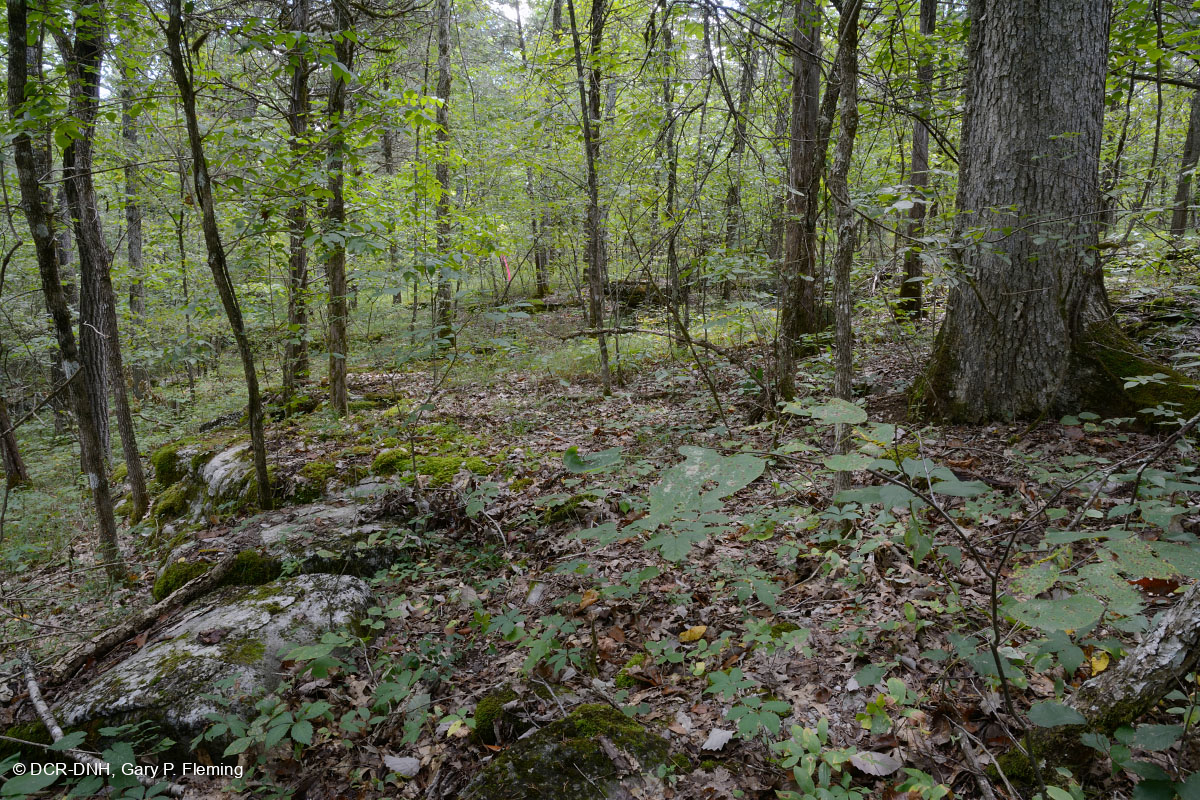 غابة جافة وصخرية كلسية على نتوء من الحجر الجيري بالقرب من كنيسة وايت شولز في منطقة سيدارز في مقاطعة لي. محمية منطقة سيدارز الطبيعية. © DCR-DNH، غاري ب. فليمينغ