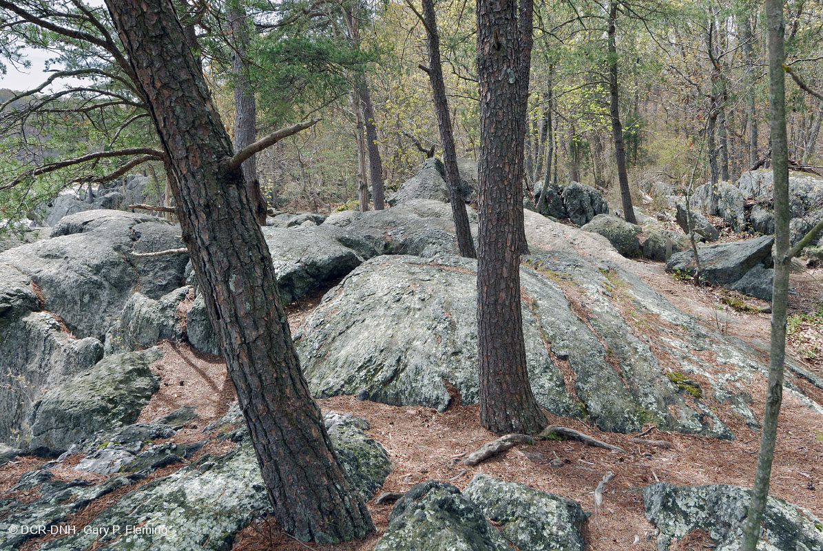 Herbs are sparse in the Riverside Bedrock Terrace Woodland due to extensive cover of exposed metagrawacke and schists. Mather Gorge below Great Falls in the Potomac Gorge, Great Falls Park, Fairfax County. © DCR-DNH, Gary P. Fleming