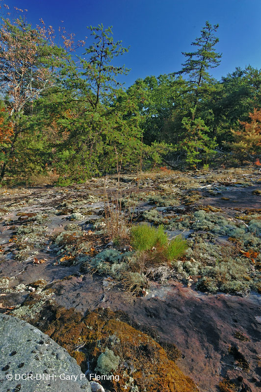 عشبة الصنوبر (Hypericum gentianoides) والقرع الأزرق الصغير(Schizachyrium scoparium var. (scoparium) ينمو في حصائر الأشنة الرنة (Cladonia spp.) في غابة مرصوفة بالحجر الرملي اللطيف؛ الجهة الجنوبية الشرقية لجبل تينكر فوق كارفينز كريك، مقاطعة Botetourt. © DCR-DNH، غاري ب. فليمنج