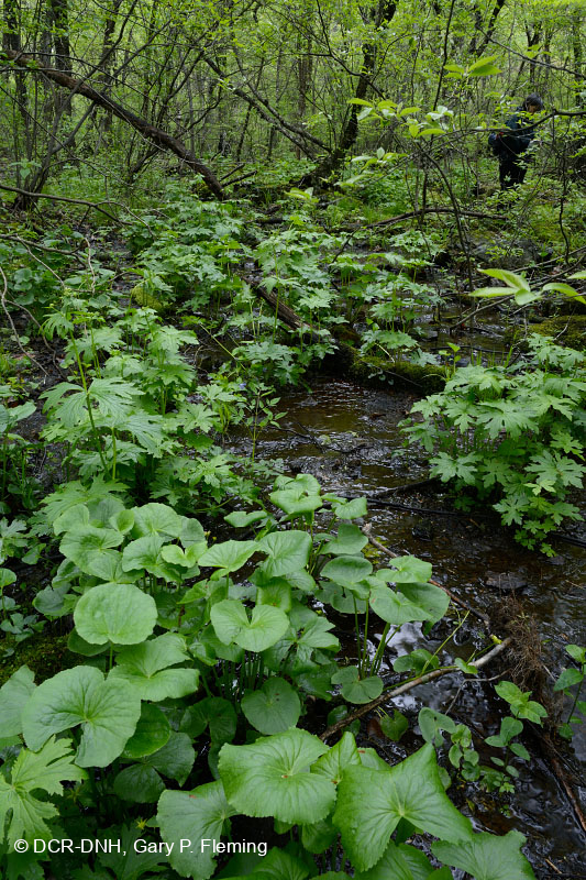 قطيفة المستنقعات(Caltha palustris var. palustris) و tassel-rue(Trautvetteria caroliniensis) في مستنقع تسرب أساسي على الجانب الجنوبي من Laurel Springs Gap في مقاطعة نيلسون. أراضي مؤتمر درب الآبالاش. © DCR-DNH، غاري ب. فليمنج