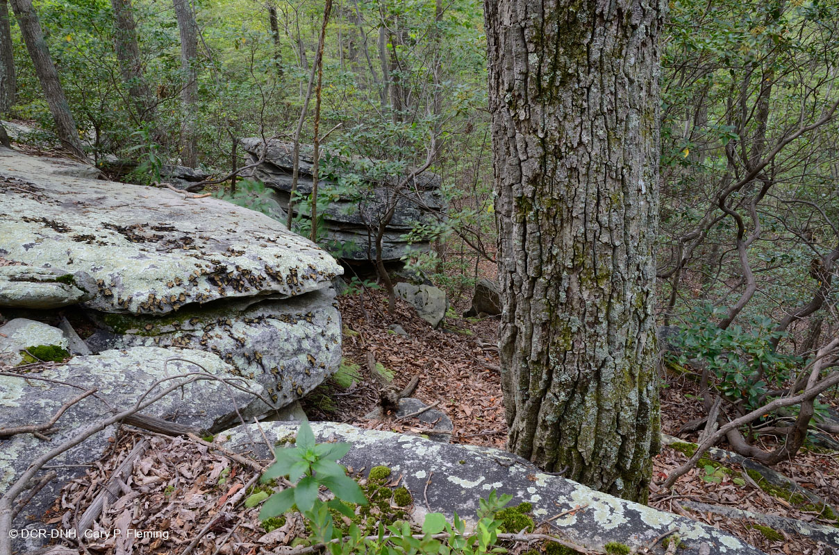 تنتشر الغابات التي يهيمن عليها بقوة بلوط الكستناء(Quercus montana)، مع انتشار بلوط الكستناء(Kalmia latifolia) في طبقة الشجيرات، في التضاريس الوعرة والصخرية غالباً في كل من الجبال وبييمونتي. التلال الوسطى لجبال بول رن، شمال هوبويل جاب، مقاطعة فوكير. © DCR-DNH، غاري ب. فليمنج