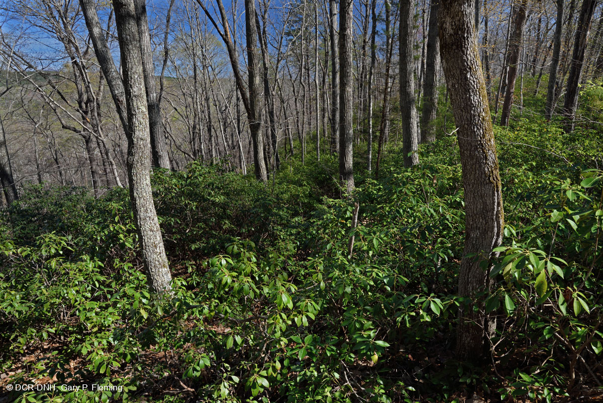 غابة شجيرة شبه مستمرة من شجيرات اللوريل الجبلي(كالميا لاتيفوليا) تحت مجموعة من أشجار البلوط الكستنائي الصغير(كويركوس مونتانا) مع أشجار صنوبر جبلية متفرقة(صنوبر الصنوبر الجبلي). تشير الرواسب الفحمية السميكة في أفق التربة العلوي هنا إلى تاريخ من الحرائق الكارثية. على سلسلة من التلال على طول نهر جيمس في منتزه جيمس ريفر ستيت بارك، مقاطعة باكنغهام. © DCR-DNH، غاري ب. فليمنج