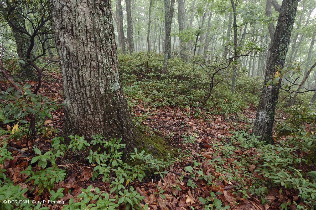غابة بلوط الكستناء في وسط جبال الأبلاش/بيدمونت الداخلية على المنحدر الشمالي الغربي لجبل بروشي فوق كارفين كريك، مقاطعة رونوك. تحل الشجيرة الجبلية دائمة الخضرة(Pieris floribunda) محل شجيرة اللوريل الجبلية باعتبارها الشجيرة المهيمنة في هذه الشجرة. © DCR-DNH، غاري ب. فليمنج
