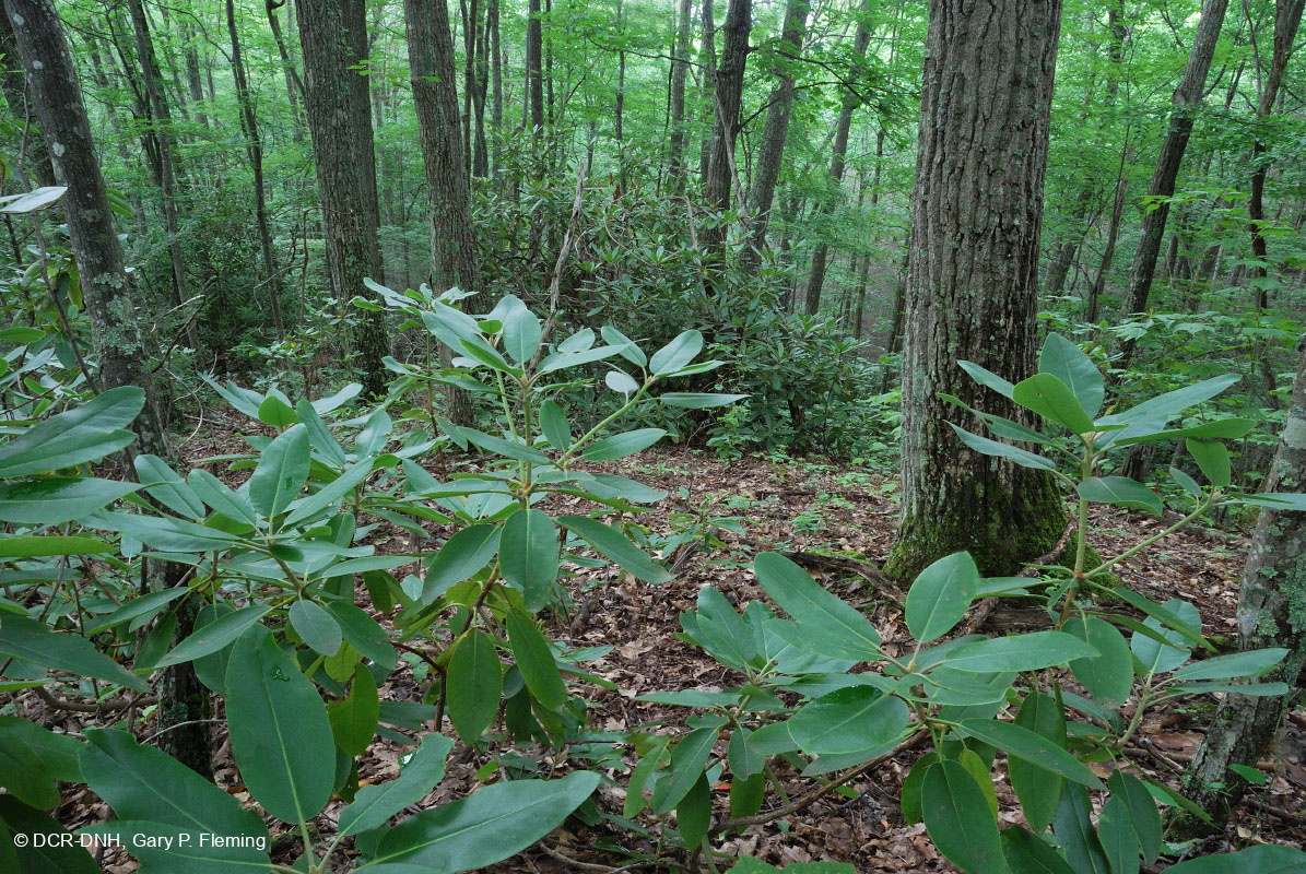 موقف كلاسيكي من نوع مجتمع غابات بلوط الكستناء/كاتاوبا رودودندرون الكستنائي/كاتاوبا رودودندرون، على نتوء من سلسلة جبال كانادايس ريدج في جبال الحديد، مقاطعة سميث. منطقة جبل روجرز الترفيهية الوطنية، غابات جورج واشنطن & جيفرسون الوطنية. © DCR-DNH، غاري ب. فليمنج