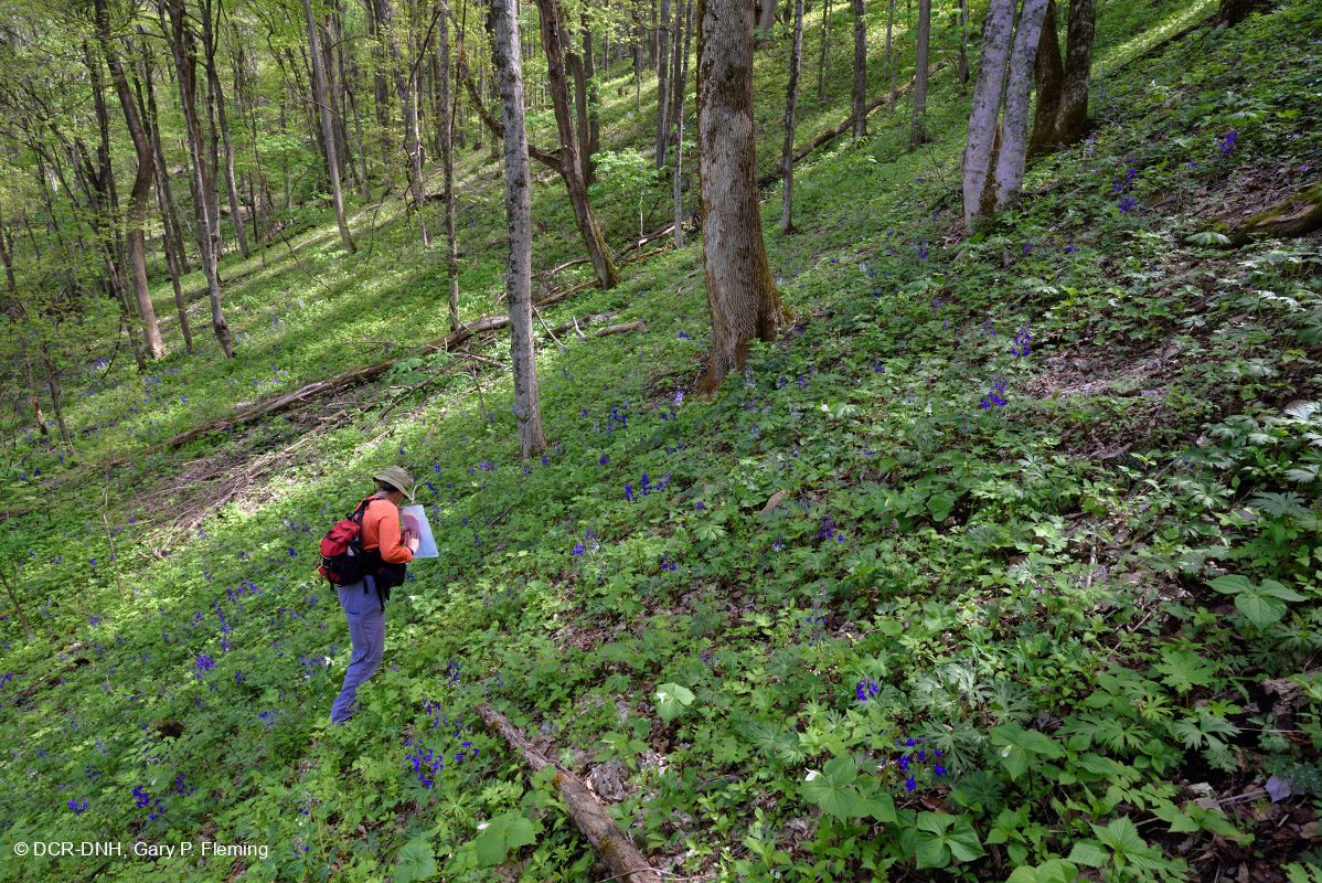 تقوم عالمة البيئة كارين باترسون من DCR-DNH بمسح بقع عشبية واسعة من نبات الدلفينيوم القزم (Delphinium tricorne)، والتريليوم الأحمر الجنوبي (Trillium sulcatum)، ونبات الماء الكندي (Hydrophyllum canadense)، والسذاب الشرابي (Trautvetteria caroliniensis)، وأنواع أخرى في غابة غنية في Tumbling Creek Cove، مقاطعة Washington. منطقة إدارة الحياة البرية بولاية كلينش ماونتن. © DCR-DNH، غاري ب. فليمنج