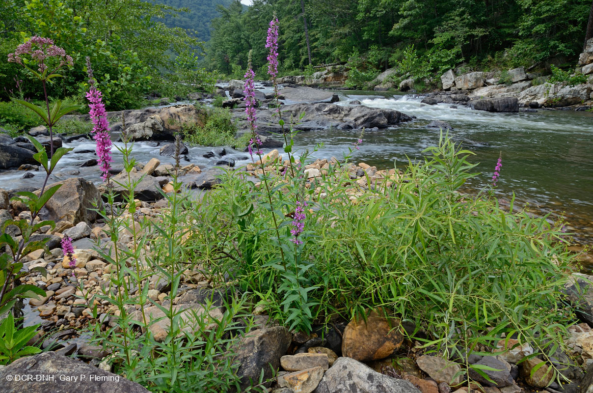 A rocky bar that has been invaded by purple loosestrife (Lythrum salicaria), an invasive non-native that is particularly problematic in Virginia on flood-scoured, river shores. Along the Maurey River in Goshen Pass, Rockbridge County. Goshen-Little North Mountain State Wildlife Management Area. © DCR-DNH, Gary P. Fleming