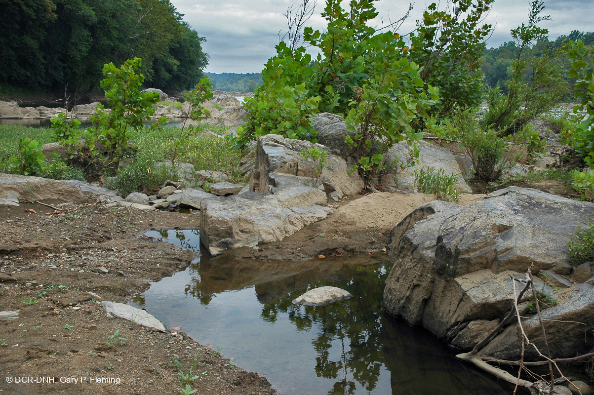 مجموعة كلاسيكية من أشجار البتولا في نهر الجميز على شكل شجيرات على شريط صخري في وادي بوتوماك الذي يتعرض لفيضانات متكررة عالية السرعة. محمية سكوتس ران الطبيعية، مقاطعة Fairfax. © DCR-DNH، غاري ب. فليمنج