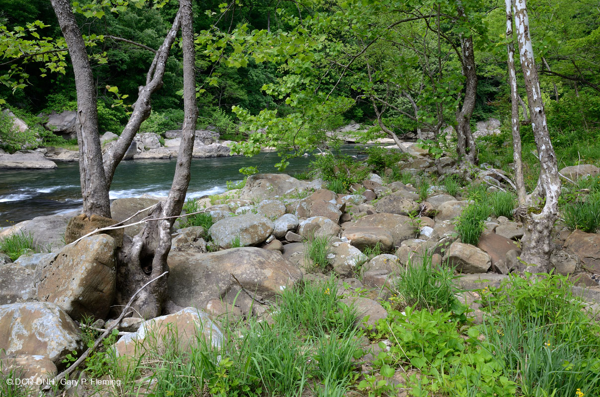 Sycamore (Platanus occidentalis) woodland on frequently scoured boulder bars in the Russell Fork Gorge at Breaks Interstate Park, Dickinson County. Note the flood-damaged tree bases. © DCR-DNH, Gary P. Fleming
