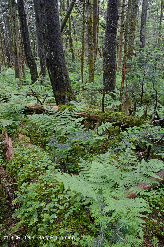 Mountain wood fern (Dryopteris campyloptera) and mountain wood-sorrel (Oxalis montana) are the only two herbs with substantial cover in Virginia's single stand of Fraser Fir Forest on the summit of Mount Rogers. Lewis Fork Wilderness Area, Mount Rogers National Recreation Area, George Washington & Jefferson National Forests. © DCR-DNH, Gary P. Fleming